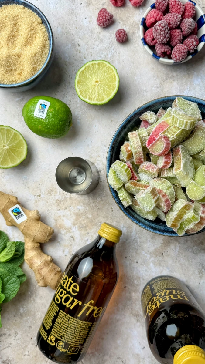 Zutaten Rhabarber-Ingwersirup: 500 g Rhabarber, 50 g Himbeeren, Saft einer halben Fairtrade-Limette, 10 g Fairtrade-Ingwer, 200 g Fairtrade-Rohrzucker, 2 dl Wasser
